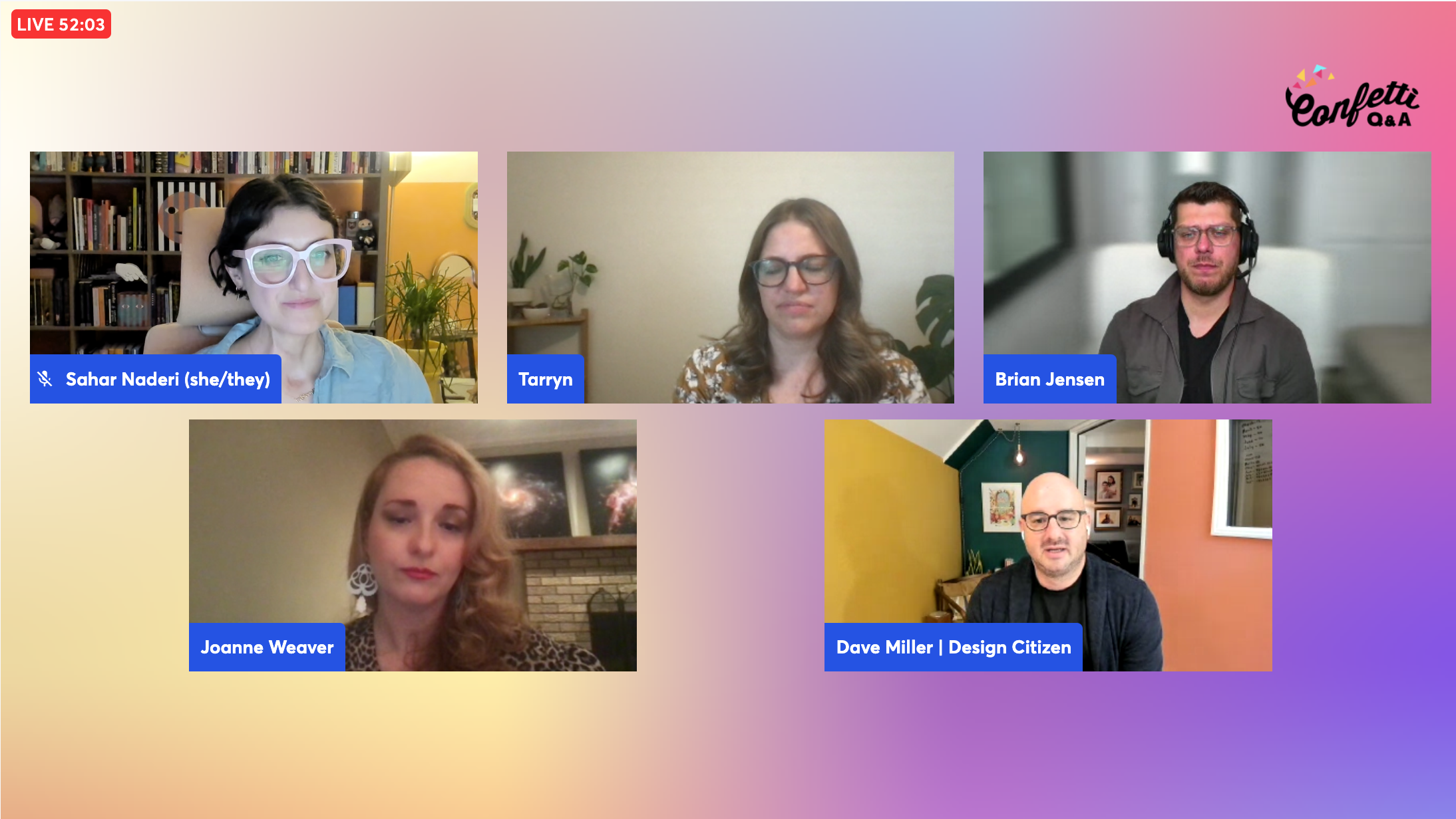 Previously, I was a discussion leader for The Sensemakers Club, where I led monthly conversations on relationship-building and networking. You can find me speaking at various UX-related panels and conferences throughout the year, with organizations like AIGA, Makesensemess, Condens, Useberry, Ladies that UX DC, MICA, etc. In 2024, I launched Confetti Q&A with Tarryn Lambert, a platform hosting Q&A panels that address various topics in the UX field and tech industry. We hosted 3-4 free events a year for the tech community between 2024-2025!
