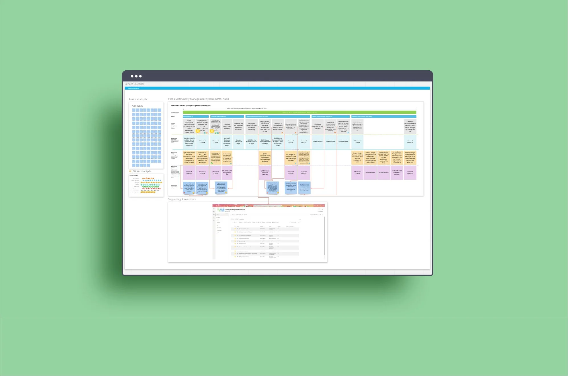 Visualized the relationships between different service components (frontstage and backstage) to uncover pain points and process improvement opportunities.